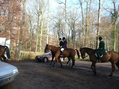 So we hunted along some more, including a good long bit in a bog covert near the cross country course. Twice hounds came up to right where we were, but the quarry must have turned back. It was beautiful to listen to, though- the air was heavy and the cry really rang through the forest, that fragmenting and regrouping of sound waves colliding with the trees, the atmosphere, and each other. Just lovely.
